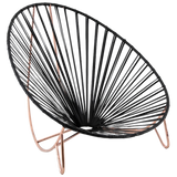 Descripción:  ¡La original silla Acapulco! ¡Silla Solar baja ideal para el mejor descanso! tejida con piel plana negra y herrería cobriza. No recomendada para uso exterior pero sí para terraza techada. Hecha en México. Con el sello de original en el herraje. Artesanía de alta calidad con historia. La separación de los rayos conforma una trama fresca y permeable, evitando el calor sofocante del verano mexicano y emulando las antiguas técnicas de tejido Maya. Favorito de los diseñadores por sus líneas limpias y su comodidad.